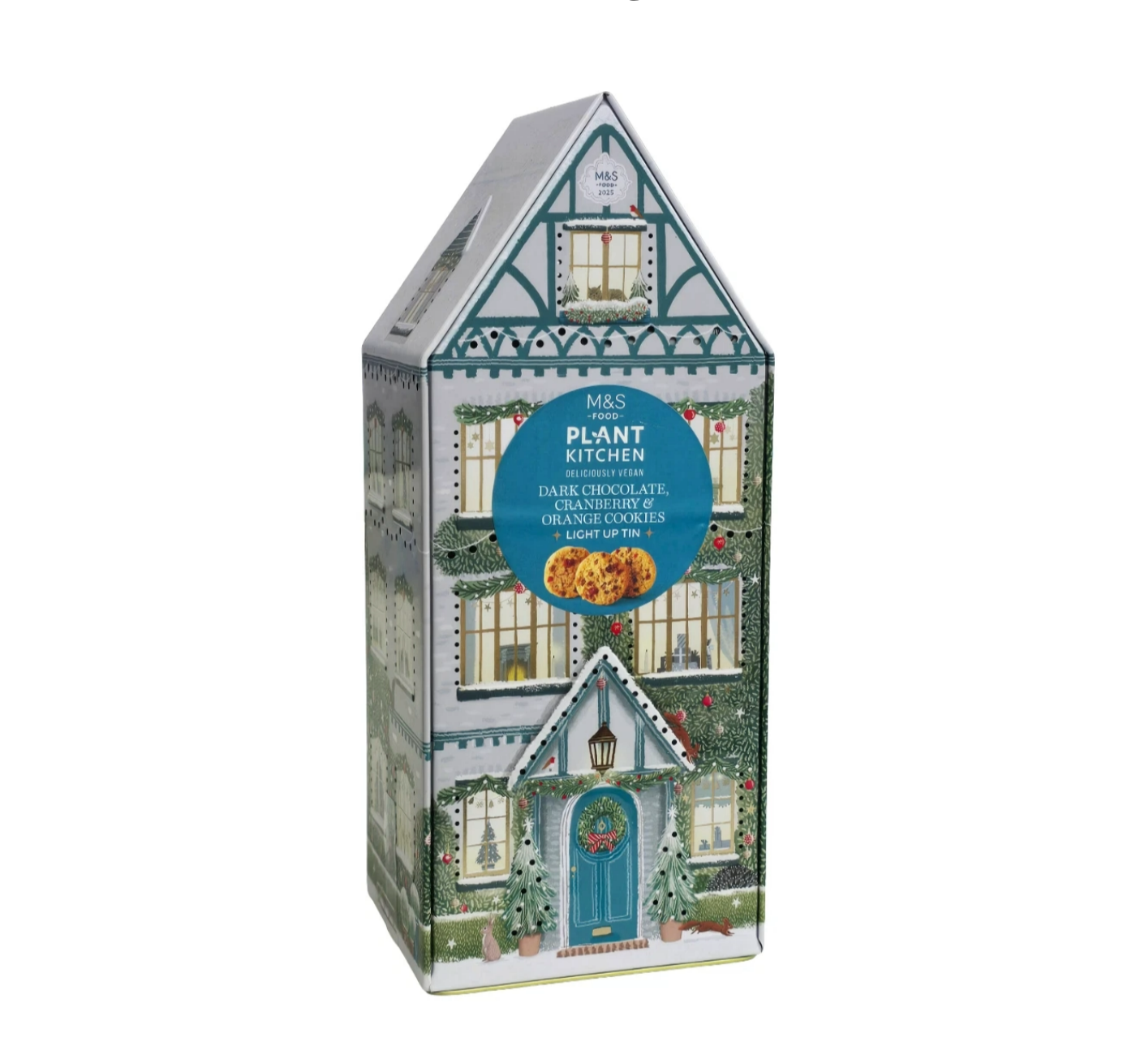 Enjoy the festive indulgence of M&S Plant Kitchen Dark Chocolate, Cranberry & Orange Cookies in a magical light-up tin. Each tin contains 8 vegan cookies, baked with rolled oats, rich dark chocolate chips, sweet dried cranberries, and zesty candied orange peel.